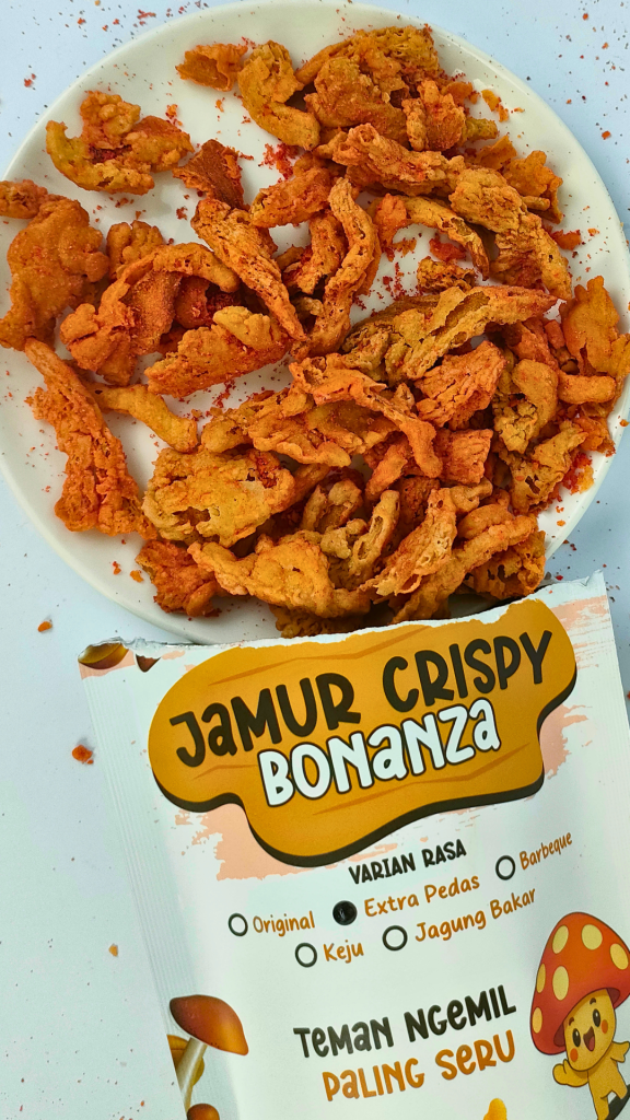Camilan renyah dari jamur pilihan yang digoreng dengan tepung bumbu gurih, tanpa pengawet, dan aman untuk semua kalangan.